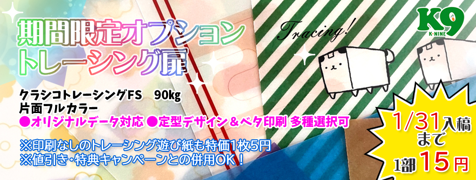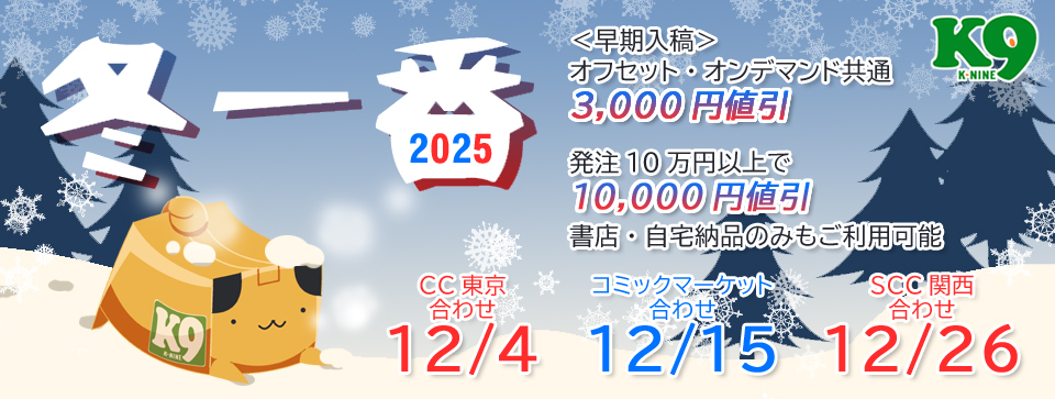 安心価格!K9の同人誌印刷は基本料金からいつでもお得!オンデマンド同人誌は5部から、オフセット同人誌は50部から!表紙フルカラーオフセットはPP加工標準です。ぜひ一度、お試しください!